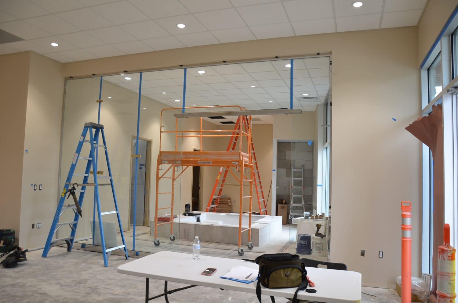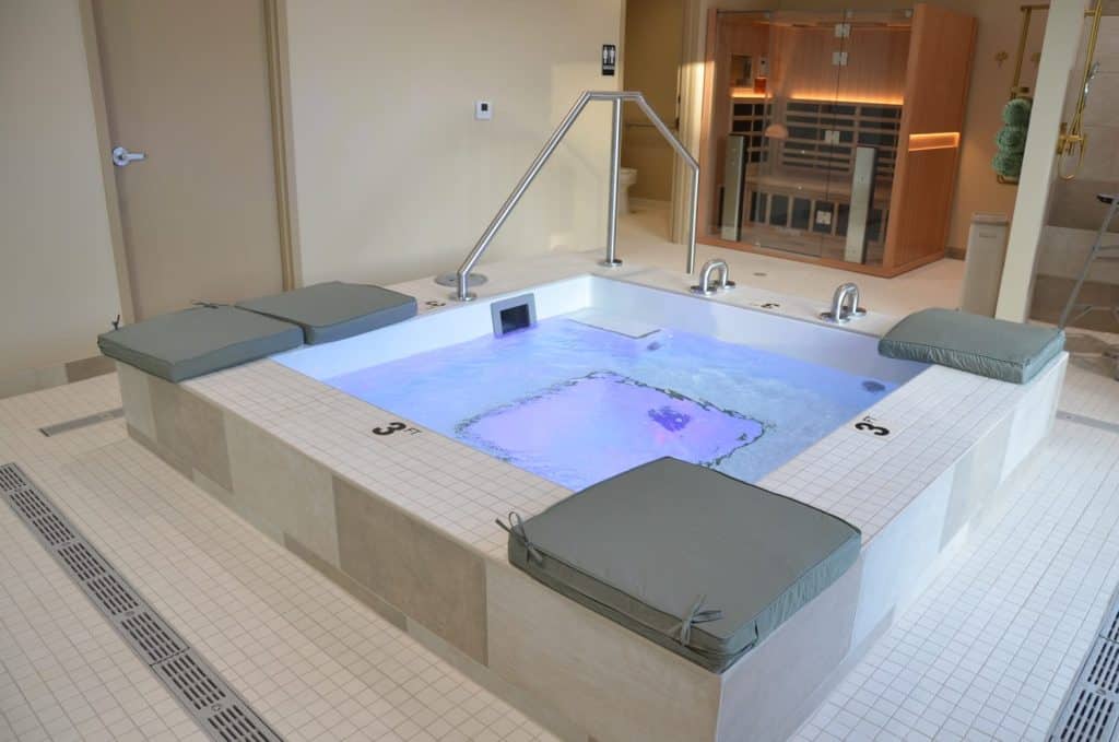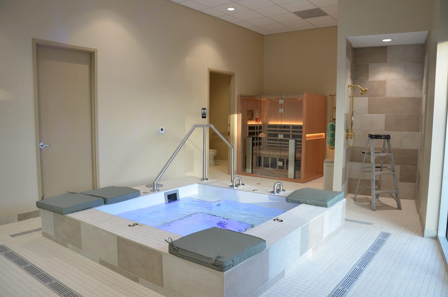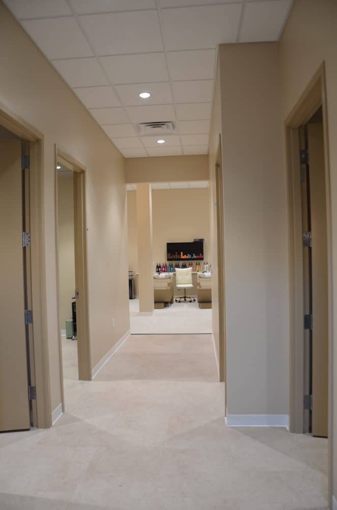 This project features a complete salon and day-spa buildout, bringing together a custom hot tub area, nail and hair stations, and a series of serene spa treatment rooms.